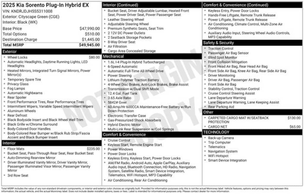 Recent Arrival! 2025 Kia Sorento Plug-In Hybrid EX 1.6L I4 DGI Hybrid Turbocharged DOHC 16V LEV3-SULEV30 6-Speed Automatic AWD 4D Sport Utility Cityscape Green Kia Certified Pre-Owned Certified, 1.6L I4 DGI Hybrid Turbocharged DOHC 16V LEV3-SULEV30, 3rd row seats: split-bench, 4-Wheel Disc Brakes, 6 Speakers, ABS brakes, Air Conditioning, Alloy wheels, AM/FM radio: SiriusXM, Apple CarPlay & Android Auto, Auto High-beam Headlights, Auto-dimming Rear-View mirror, Automatic temperature control, Brake assist, Bumpers: body-color, Cargo Net, Carpeted Cargo Mat w/Seatback Protection, Carpeted Floor Mats, Delay-off headlights, Driver door bin, Driver vanity mirror, Dual front impact airbags, Dual front side impact airbags, Electronic Stability Control, Emergency communication system: 911 Connect, Exterior Parking Camera Rear, Four wheel independent suspension, Front anti-roll bar, Front Bucket Seats, Front Center Armrest, Front dual zone A/C, Front fog lights, Front reading lights, Fully automatic headlights, Heated door mirrors, Heated Front Bucket Seats, Heated front seats, Illuminated entry, Knee airbag, Leather steering wheel, Low tire pressure warning, Navigation System, Occupant sensing airbag, Outside temperature display, Overhead airbag, Overhead console, Panic alarm, Passenger door bin, Passenger vanity mirror, Power door mirrors, Power driver seat, Power Liftgate, Power passenger seat, Power steering, Power windows, Radio data system, Radio: AM/FM/SiriusXM Audio System, Rear air conditioning, Rear anti-roll bar, Rear reading lights, Rear side impact airbag, Rear window defroster, Rear window wiper, Remote keyless entry, Security system, Speed control, Speed-sensing steering, Split folding rear seat, Spoiler, Steering wheel mounted audio controls, SynTex Artificial Leather Seat Trim, Tachometer, Telescoping steering wheel, Tilt steering wheel, Traction control, Trip computer, Turn signal indicator mirrors, Variably intermittent wipers, Wheel Locks, Wheels: 19" Machine-Finished Alloy, 1.6L I4 DGI Hybrid Turbocharged DOHC 16V LEV3-SULEV30.
