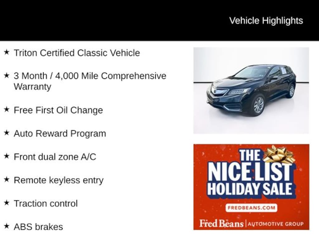 Triton Certified Classic Vehicle, 3 Month / 4,000 Mile Comprehensive Warranty, Free First Oil Change, Auto Reward Program, ABS brakes, Alloy wheels, Compass, Electronic Stability Control, Front dual zone A/C, Heated door mirrors, Heated front seats, Heated Front Sport Seats, Illuminated entry, Low tire pressure warning, Power Liftgate, Power moonroof, Remote keyless entry, Traction control.